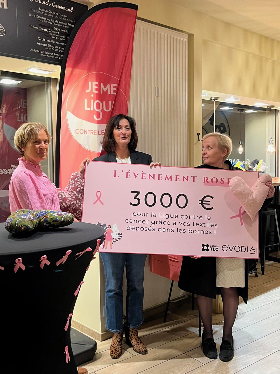 Ce jeudi 7 novembre, Annick Laurent, directrice d’Évodia et Geneviève Pötgens, directrice de Vosges TLC, ont remis un chèque de 3000 € à Brigitte Romary de la Ligue Contre le Cancer Comité des Vosges.